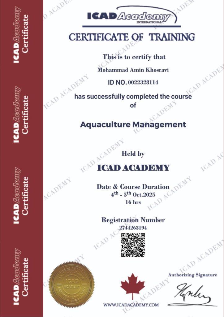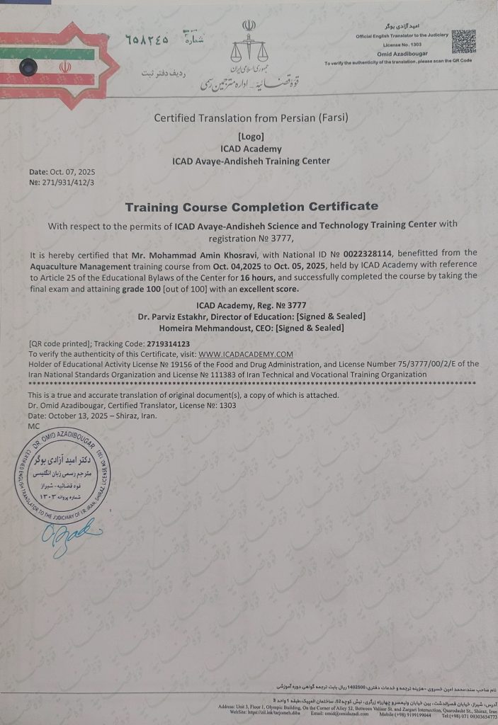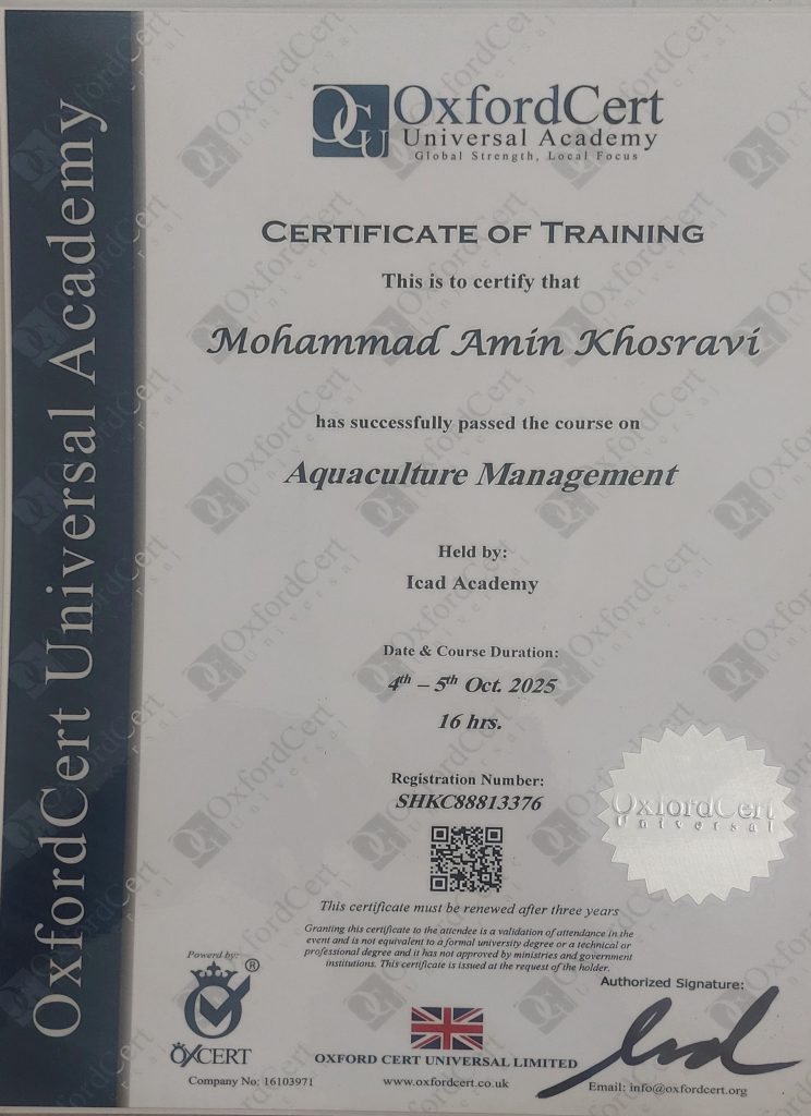 دارنده گواهینامه بینالمللی مدیریت پرورش آبزیان از آکادمی Oxford Cert کشور انگلستان 🇬🇧
